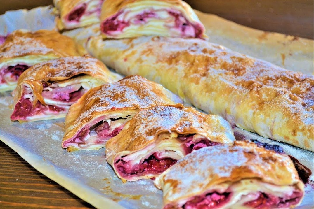 Додаємо будь-які ягоди. З вишнею чи черешнею – ідеальне поєднання. Розкладаємо ягоди зверху. Починаємо загинати краї та загортати все в рулет.