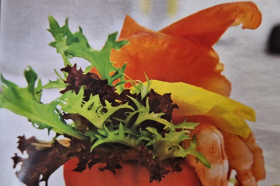 Креветки відваріть в підсоленій воді. Почистіть їх. В помідори викладіть томатну начинку та покладіть листя салату. Воно гарно буде виглядати з помідорів. Можна використовувати будь-який салат, але гарно буде фрізе або лоло-росо. Викладіть по три креветки та лимонну скибку.