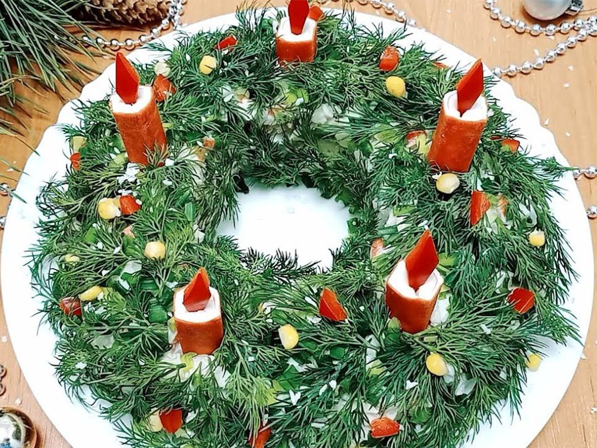 У народі кажуть: «Вміла приготувати, та не вміла подати». Щоб цього не трапилося, скористайтеся нашими порадами: оформте салати, що добре тримають форму у вигляді різдвяного віночка. Новорічний вигляд матимуть «Олів’є», «Крабовий», «Мімоза» і подібні салати.