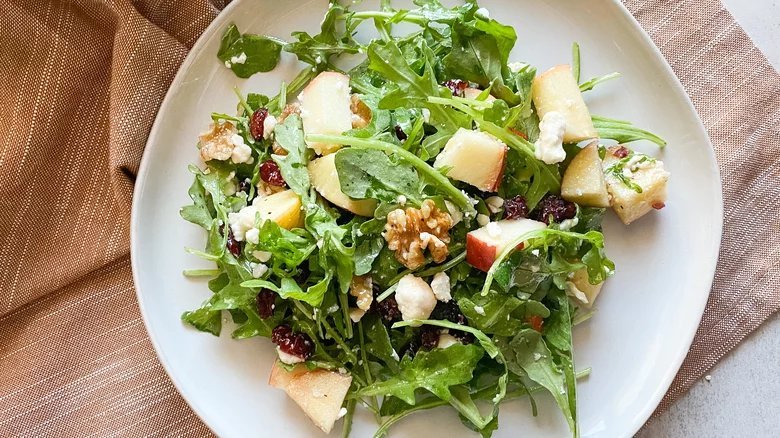 Що вийде, якщо змішати рукколу, яблука, волоські горіхи та легку ароматну заправку? Оригінальний пікантний салат!