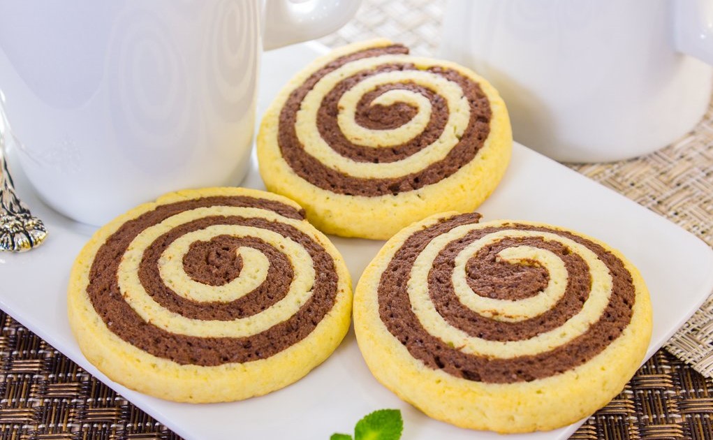 В одну з частин вмішайте какао-порошок, а в іншу додайте ще трохи борошна. Окремо їх вимішуйте до щільного стану. Коли вони будуть готові, тоді треба зробити наступне. Розкачайте два пласти тіста, покладіть білий на коричневий та ще раз пройдіться качалкою. Виходить двошарове та різнокольорове тісто. Тепер згорніть щільним рулетом.