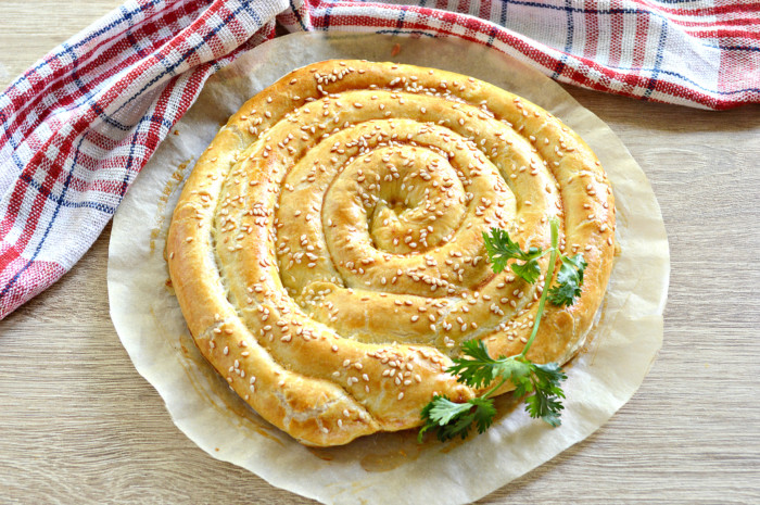 З першого рулетика сформуйте равлика й перекладіть на застелену пергаментом форму. Далі кожен рулетик кладіть навколо, щоб вийшов пиріг у вигляді равлика. Змастіть зверху яйцем й ставте випікатися у розігріту на 180 духовку протягом 40 хвилин. Коли побачите на пирогу золотисту скоринку – він готовий. Смачного!