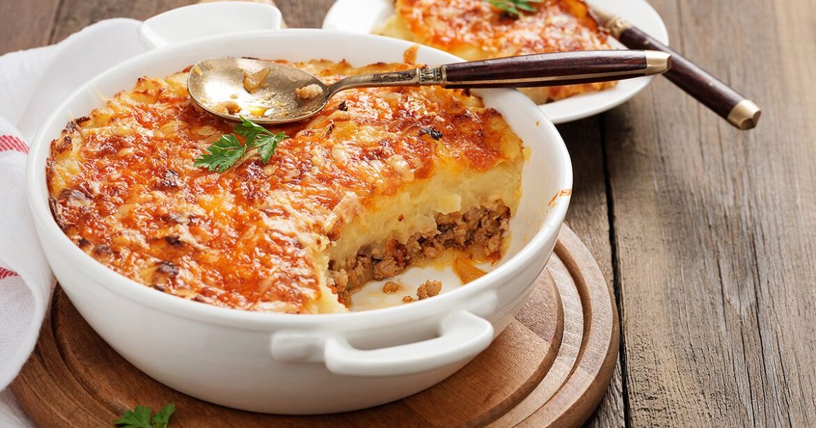 Викладіть у форму половину картопляного пюре, а на нього – шар фаршу. Потім знову покладіть шар пюре й рівномірно розподіліть. Наріжте 30 г вершкового масла й розкладіть на картоплі. Запікайте в духовці, розігрітій до 180 градусів, протягом 35 хвилин. За 10 хвилин притрусіть натертим сиром. Смачного!