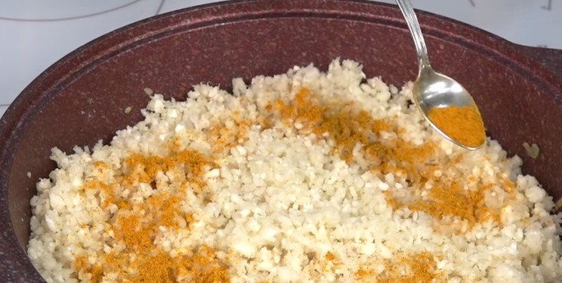 На розігріту з олією сковорідку покладіть нарізний часник, смажте, поки не відчуєте аромат, дивіться, щоб не підгорів. Потім наріжте цибулю й покладіть до часнику на сковорідку. Після цього – перець й печериці. Свіжу цвітну капусту натріть на тертці, вона буде дуже схожою на рис.