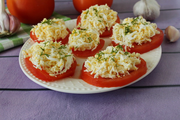 Помідор наріжте на кільця завтовшки 5 мм. В мисочці змішайте майонез, подрібнений часник, кріп та натертий сир. Це і буде ароматна начинка. Якщо хочете, можете сюди додати на ваш смак консервовану кукурудзу або запечене м’ясо.