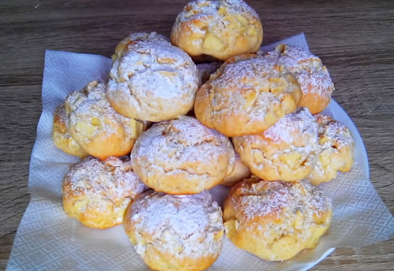 Додайте до тіста нарізані кубиками яблука. Змочіть руки водою та сформуйте кульки потрібного вам розміру. Викладіть печиво на деко, застелене пергаментом й випікайте 15-20 хвилин. За бажанням печиво можна посипати цукровою пудрою.