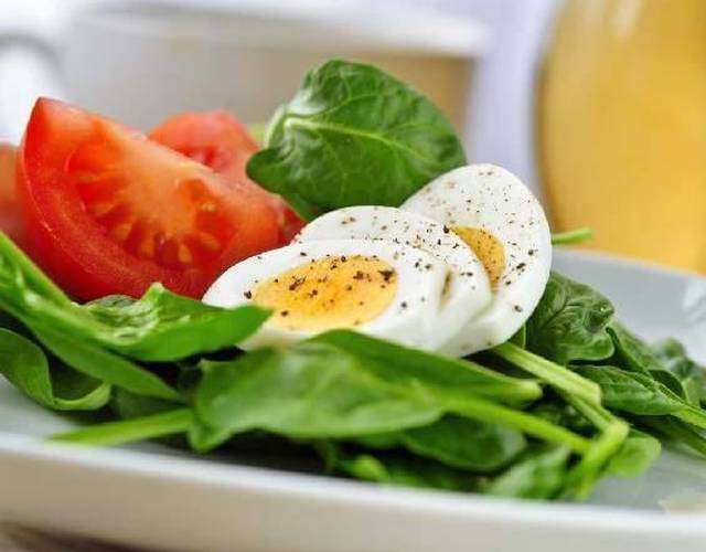 Шпинат потрібно нарізати смужками. Помідори поріжте скибками. Перекладіть все разом в салатник. Додайте нарізані на шматочки яйця.