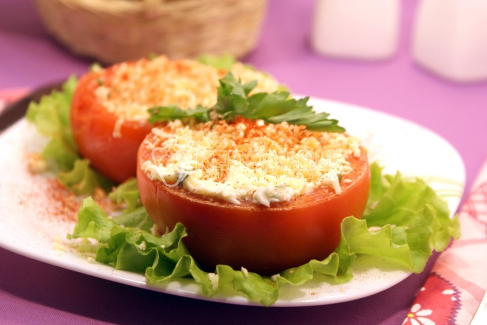 Окремо змішуємо майонез, подрібнені на тертці яйця, дрібно порубану зелень та часник. Переносимо начинку на кружечки томатів.