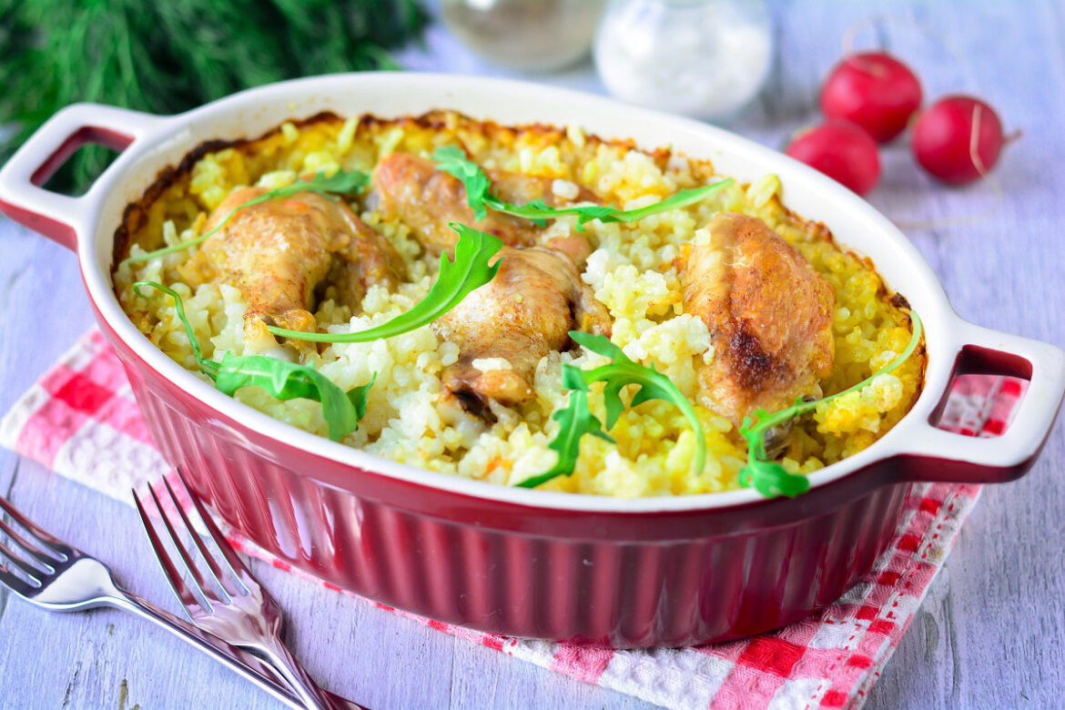 Каструлю з рисом постав на плиту, курку замаринуй, то вари, інше запікай. Не треба робити так багато дій та бруднити весь посуд. Зробіть все швидше та простіше. Пропонуємо ідею для смачної вечері. Для неї можна використовувати не лише рис, але й будь-яку іншу крупу на ваш смак: гречка, булгур, пшоно та ін.