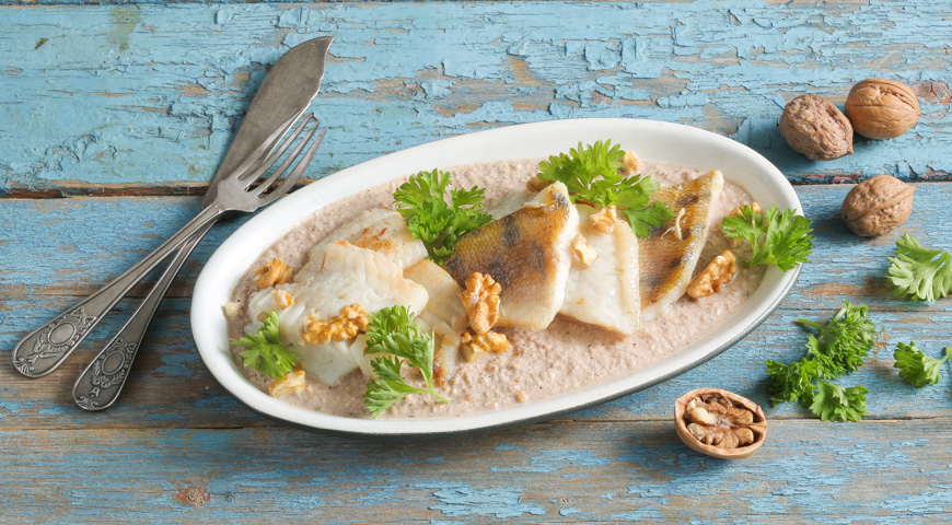 Home Рецепти Рецепт пікантної риби з часниково-горіховим соусом