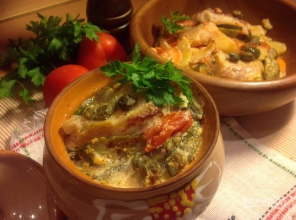 Розкладіть овочі у горщики. Зверху покладіть рибу. Залийте все соусом, який треба зробити з сметани та томатної пасти. Якщо є потреба, можете долити трохи води. Посоліть, поперчіть та покладіть маслини.