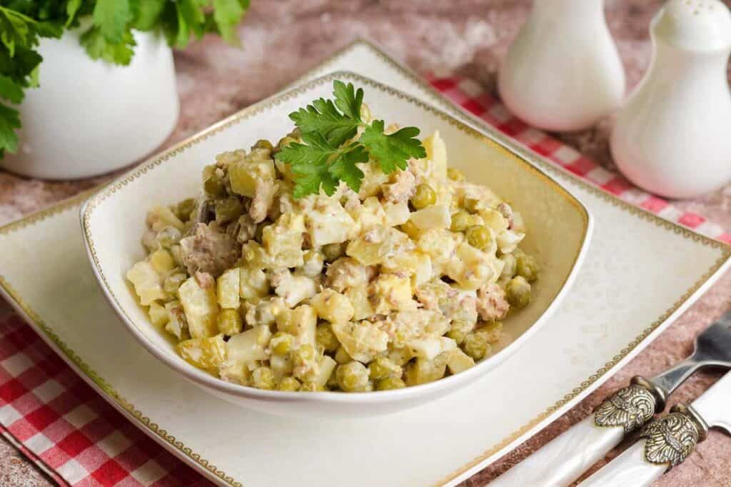 Рибу треба очистити від шкірки та костей, розібрати на філе. Наріжте кубиками та змішайте з іншими продуктами, які тако треба нарізати (картопля, солоні огірки, зелений салат, зелена цибуля). Додайте горошок.