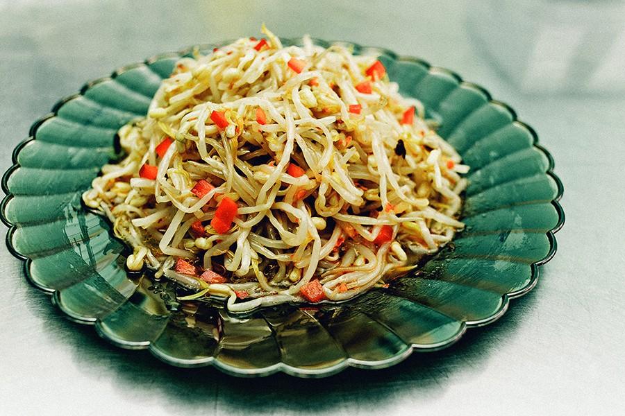 Лишається полити соусом, посипати петрушкою та через декілька хвилин зняти з вогню. Наприкінці покладіть паростки сої. Салат готовий. Смачного!