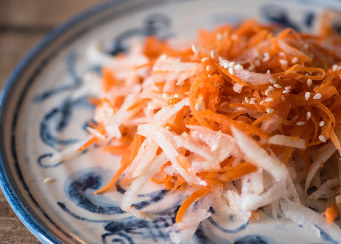 Підготуйте овочі, почистіть моркву та дайкон. Натріть їх на тертушці для корейської моркви або наріжте ножем тонкою соломкою. Пересипте натерті коренеплоди сіллю і дайте постояти 10 хвилин, щоб з’явився сік. Морква і дайкон стануть м’якшими та соковитішими.