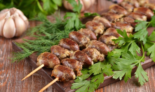 1. Серця готуємо на дерев’яних шпажках довжиною 30 см. Для двох порцій потрібно 24 серця, по 12 шт. на шпажку. Серця добре промиваємо і, якщо є всередині кров’яні згустки, то натискаємо пальцями на серця і кров легко видаляється.