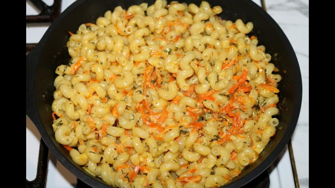 Доки макарони твердих сортів варяться, приготуйте смачну засмажку. На розігріту сковорідку влийте олію, додайте порізану кубиками цибулю, обсмажте до м’якості, потім додайте натерту моркву. На помірному вогні тушкуйте до м’якості моркви.