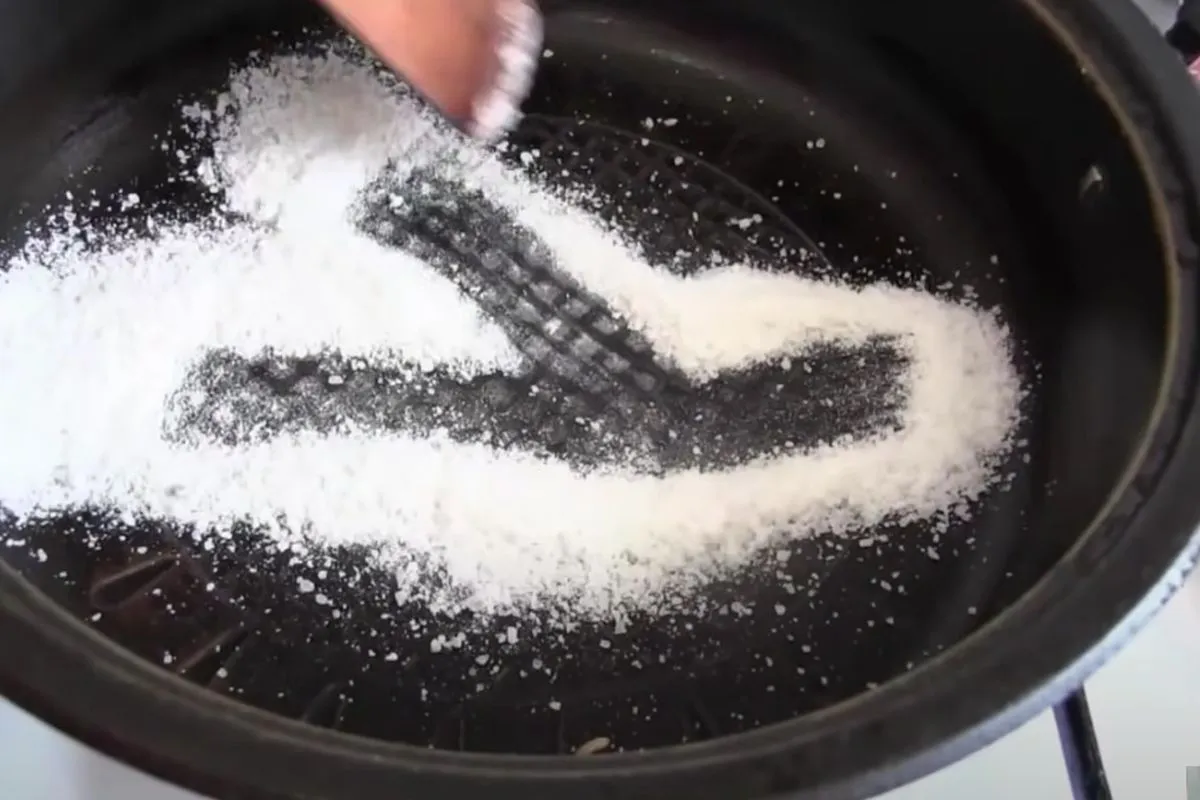 Треба поставити сковорідку на вогонь та нагріти. Потім висипати 3 столові ложки солі. Періодично помішуючи, просмажте сіль, доки вона не змінить свій колір із жовтим відтінком.