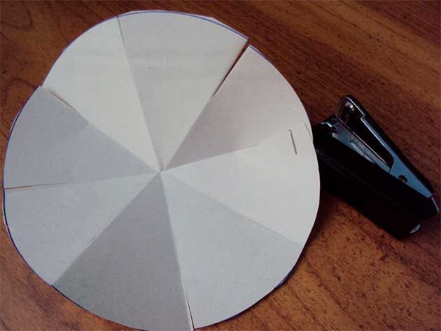 Складіть круг навпіл, потім ще раз і ще, щоб вийшло 8 промінчиків-згинів. Розправте аркуш і трохи надріжте згини, але не до кінця. Розрізайте на висоту потрібної вам форми. З’єднайте надрізи, заходячи краями один на одного і скріпіть степлером.