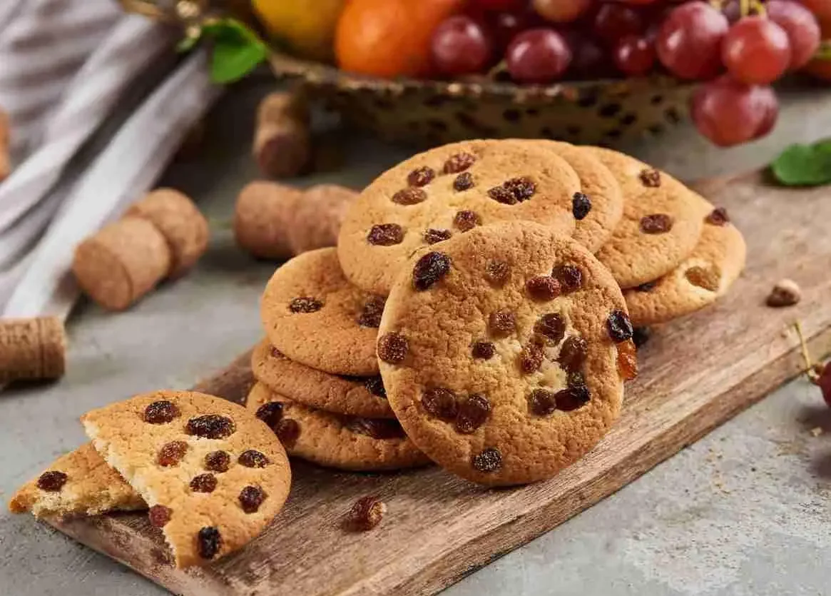 У мисці змішайте м’яке вершкове масло, цукор, сіль, ваніль. Додайте яйце і ложкою все розітріть. Всипте половину борошна з розпушувачем, родзинки й перемішайте. Додайте решту муки й замісіть м’яке тісто. Покладіть у холодильник на 20 хв.