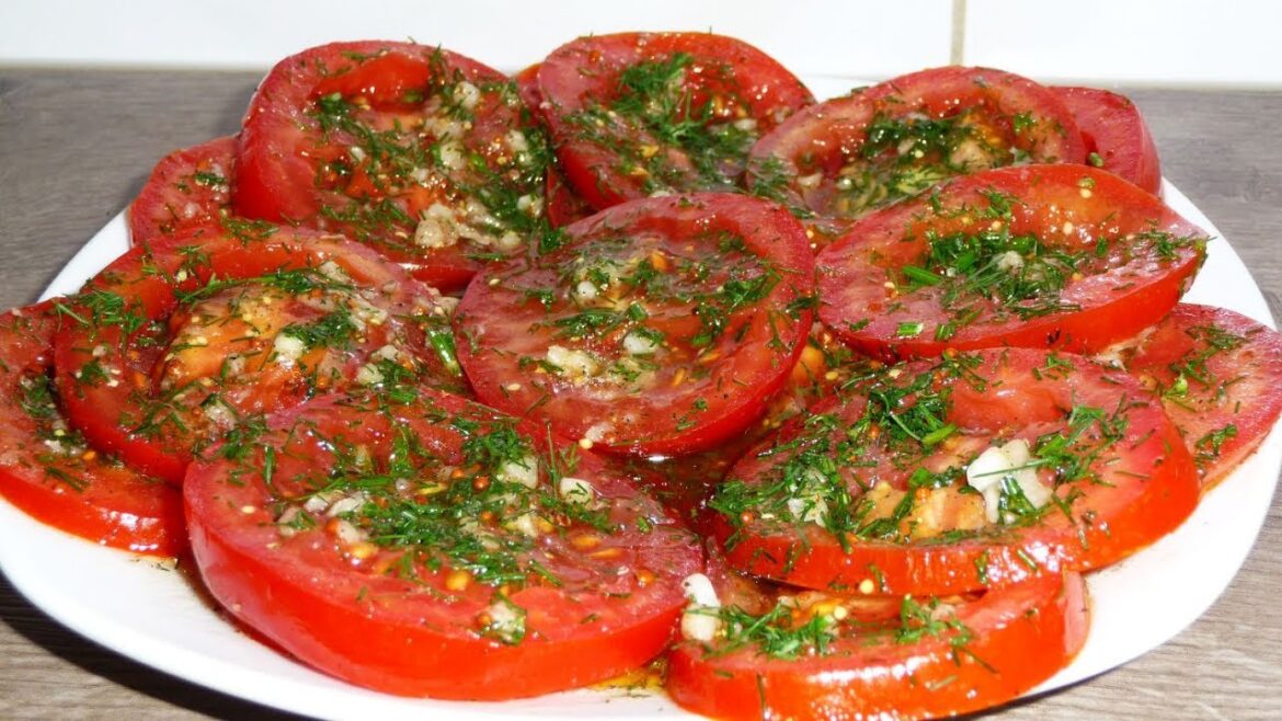 Цей рецепт цінний швидкістю приготування. Вам потрібно тільки змішати інгредієнти та потім все разом з помідорами відправити в холодильник. Всього за 30 хвилин ви будете мати чудову закуску до будь-яких страв.