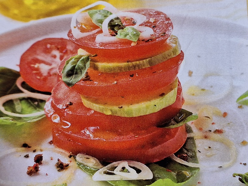Помідори наріжте тонкими кружальцями, як і цибулю. Салат краще подавати та робити окремими порціями.
