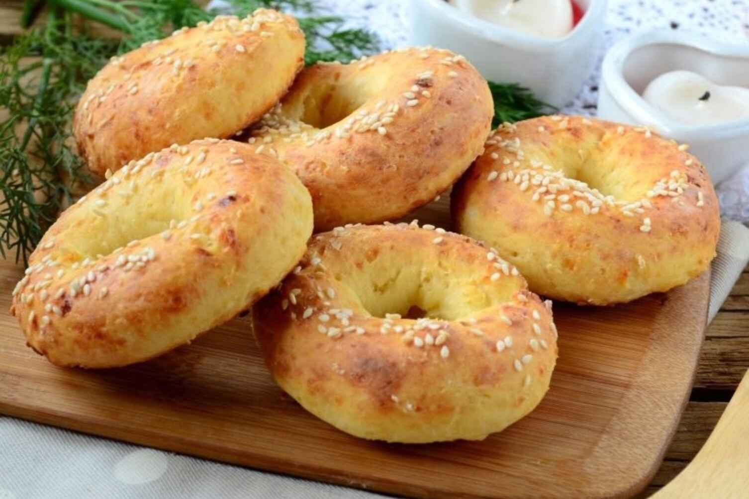 Викладіть бублики на деко, застелене пергаментом. Зверху змастіть їх яєчним жовтком, змішаним із молоком й посипте кунжутом. Випікайте при температурі 180 градусів протягом 30 хвилин до золотистого кольору.