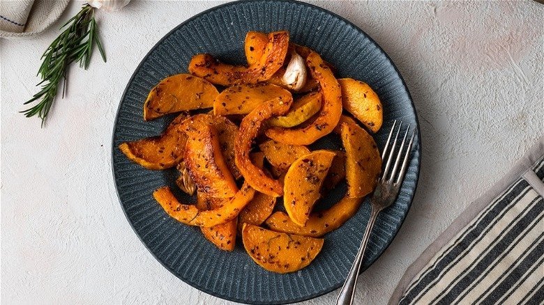 4. Посипати зверху гарбуз насінням кмину та перцем чилі, приправити сіллю та перцем за смаком. Додати гілочки розмарину або базиліка, суху подрібнену м’яту, біле вино та розчавлені зубчики часнику.