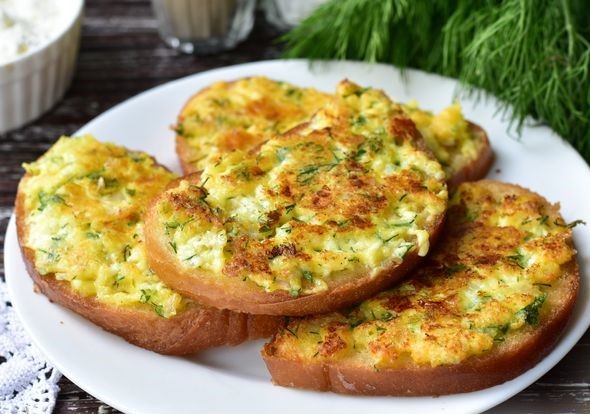 Хліб наріжте на скибки. Потім у мисці поєднайте фарш та вершковий сир. Додайте до них сіль, спеції. Викладіть начинку на хліб та відправте скибки на деко. Посипте тертим сиром.