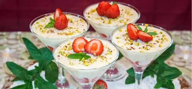 Для подачі цього десерту дуже добре підходять келихи для мартіні, але ви можете використовувати ті, які ви маєте. На дно келиха викладаємо нарізані полунички