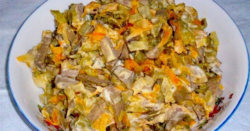 Приготуйте на вечерю смачний салат з простих інгредієнтів. Обсмажена до золотистого кольору ніжна куряча печінка, яка тане у роті, та солоний огірок смачно поєднуються у цьому салаті.