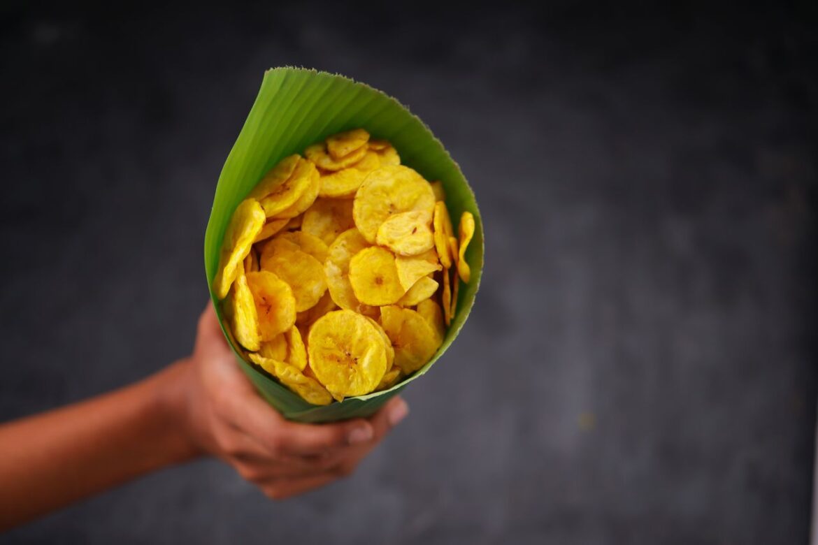 Банани для чіпсів вибирайте цілі та щільні. М’які не підійдуть для цього. Наріжте тонкими кружальцями без шкірки.