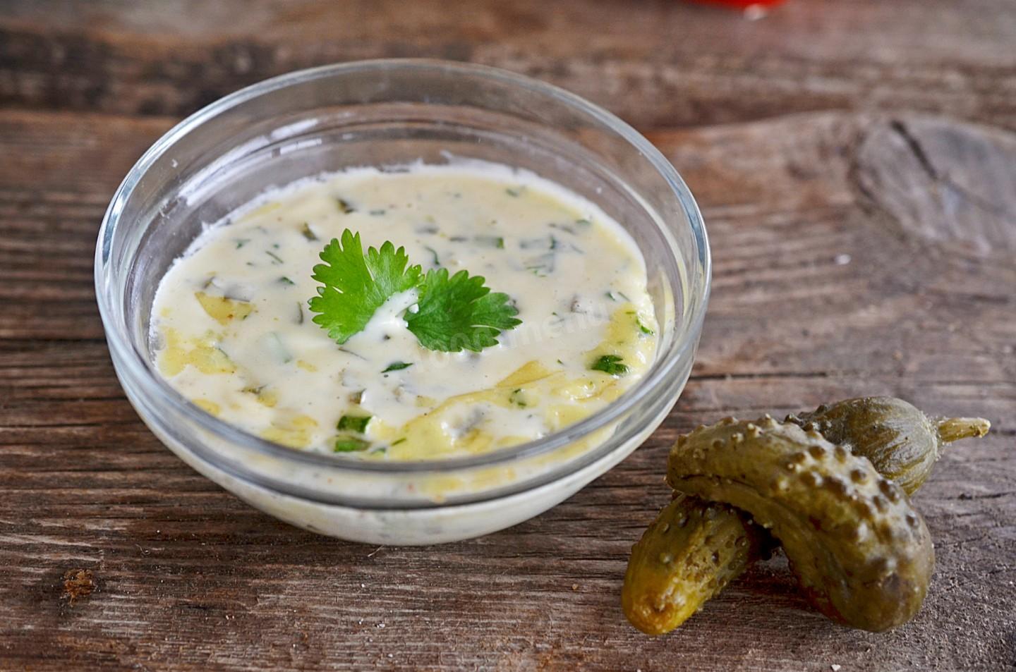 Якщо ви хочете зробити смак легшим, можна взяти майонез та сметану в пропорції 50/50. Також готують соус на основі йогурту. Це найпростіший та швидкий варіант приготування.