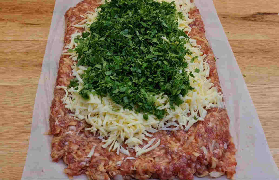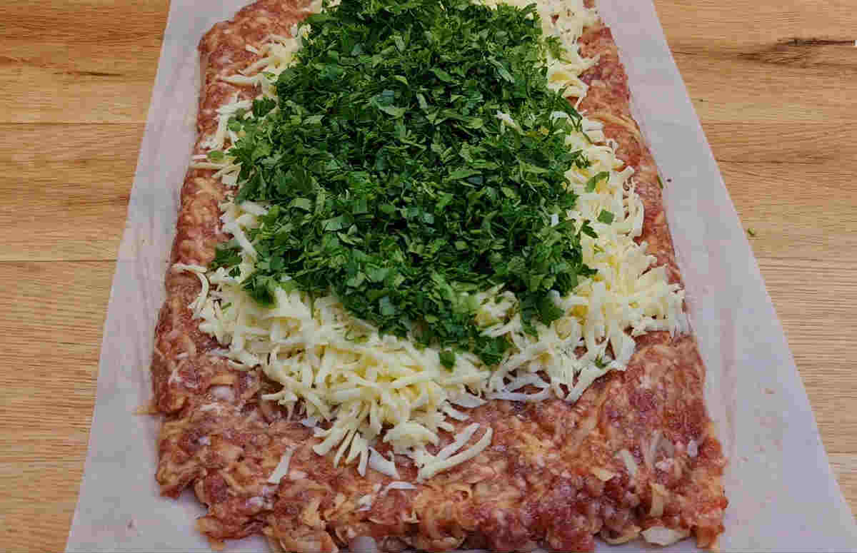 Потім дістаємо харчову плівку і рівним шаром викладаємо фарш, додаємо тертий сир та утрамбовуємо продукти. Згортаємо в трубочку як ковбасу, відправляємо в морозилку на 4 години.
