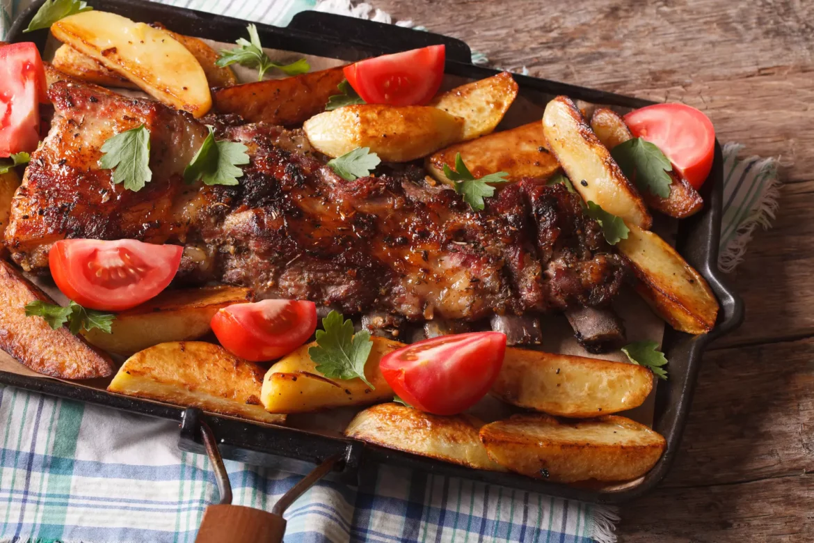 Подавайте запечені ребра з картоплею по-селянськи, зеленню, овочами та улюбленими соусами.