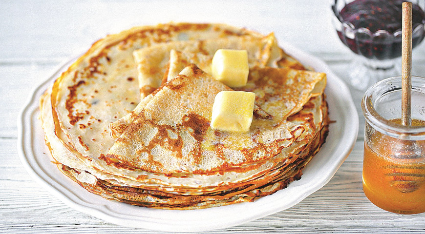 Так само випікайте інші млинці, промазуючи вершковим маслом і складаючи один на одного. Подавайте з варенням, сметаною, медом або будь-якими начинками.