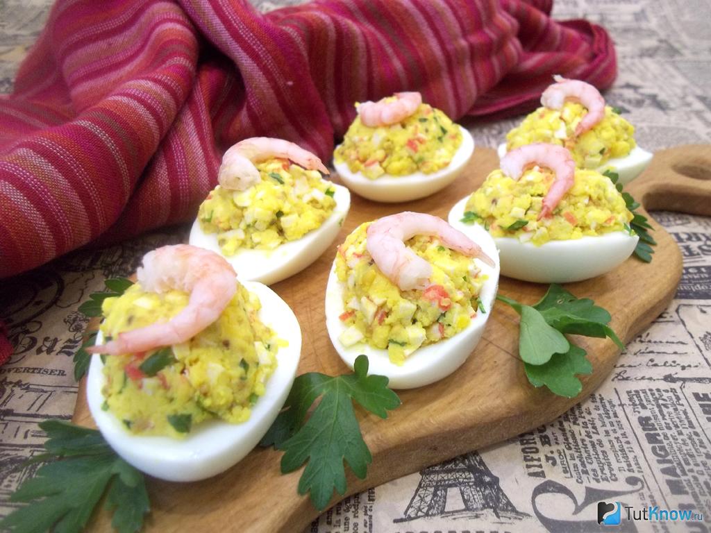 Її роблять з креветок. Відваріть креветки, подрібніть їх та перемішайте з жовтком. Можна трохи додати майонезу. Зверху фаршироване яйце декоруйте цілою креветкою.