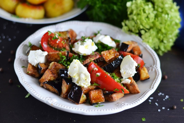 Приготуй оригінальний теплий салат із запечених баклажанів. Цей салат гідний опинитися в меню будь-якої господині. Баклажани, соковиті стиглі помідори, ніжний сир і все це під кисло-солодкою заправкою. Таке смачне поєднання ви ніколи не забудете, а салат одразу стане фаворитом.
