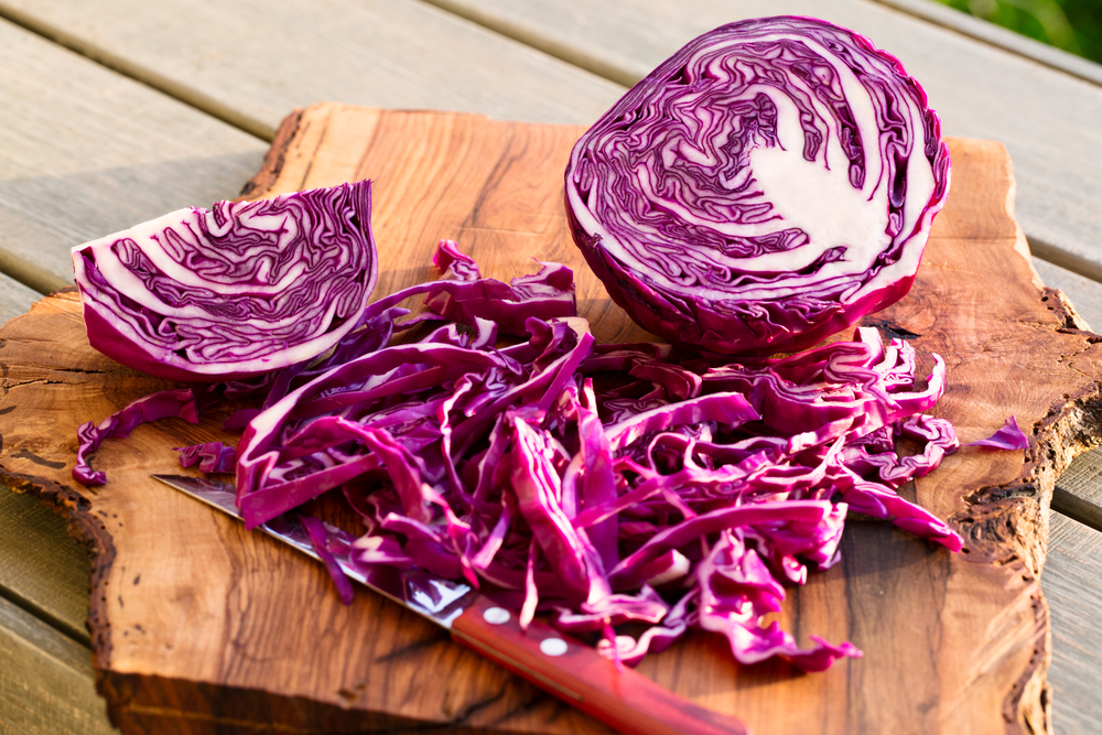 Червонокачанну капусту наріжемо дрібно ножем або за допомогою шатківниці. Підсоліть її і трішки пожмакайте її руками.