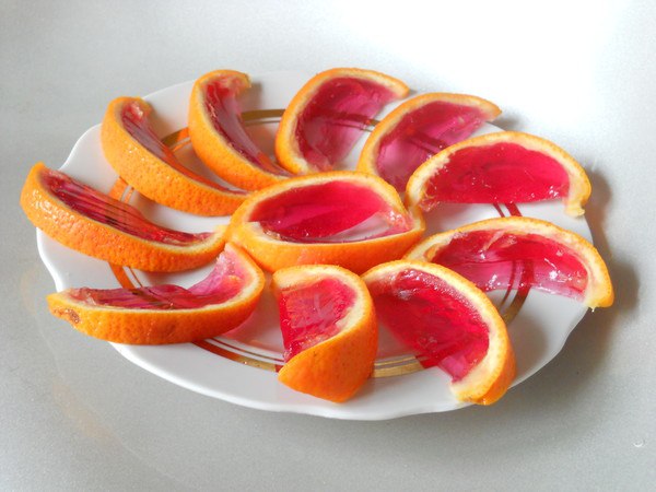 Желатин замочіть на 1 годину в 150 мл холодної води для набухання. Апельсини або мандарини вимийте, розріжте навпіл, видаліть м’якуш.
