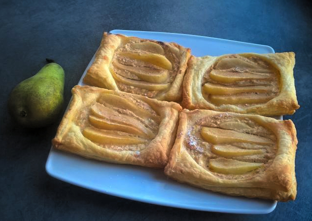 Розморозьте листкове тісто згідно з інструкцією. Тим часом наріжте груші тоненькими скибочками, а сир — шматочками.