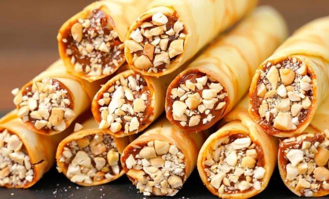 Для начинки згущене молоко збийте разом з маслом. Наповніть трубочки та опустіть краї в подрібнені горіхи. Смачного!