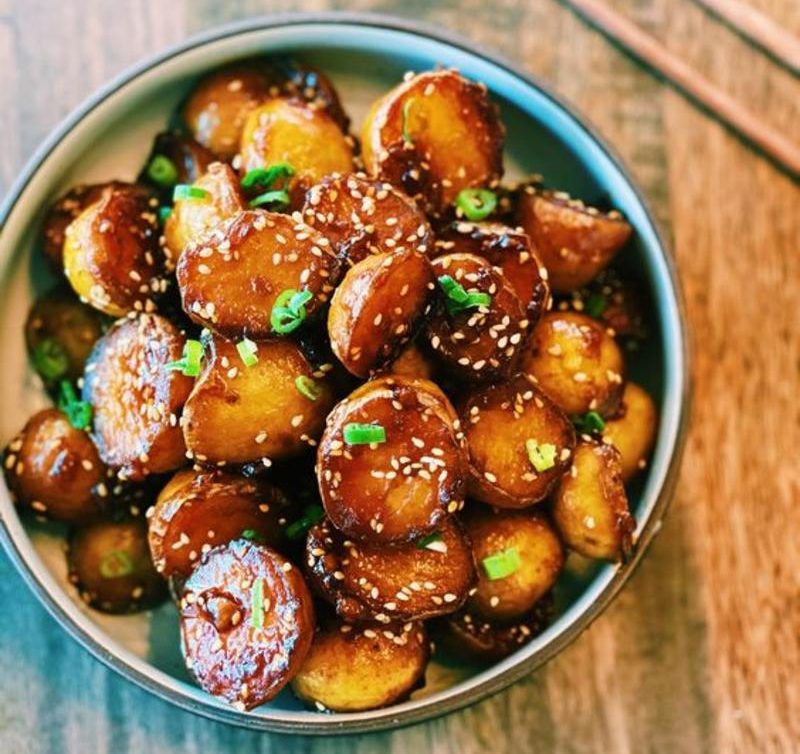 Тим часом приготуйте глазур: змішайте соєвий соус, мед, часник (пропущений через прес). Полийте картоплю, готуйте протягом п’яти хвилин, постійно помішуючи, доки соус не загусне, а картопля не стане мідного відтінку.