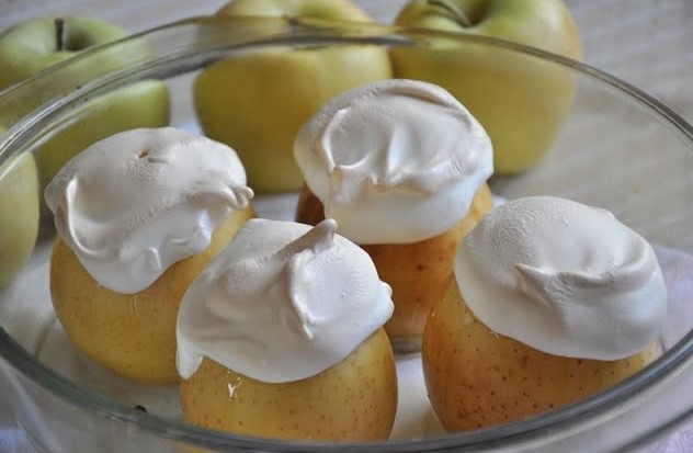 На яблука викладіть крем та поставте в духовку ще на 1-2 хвилини. Крем має злегка стати рум’яним. Десерт готовий. Смачного!