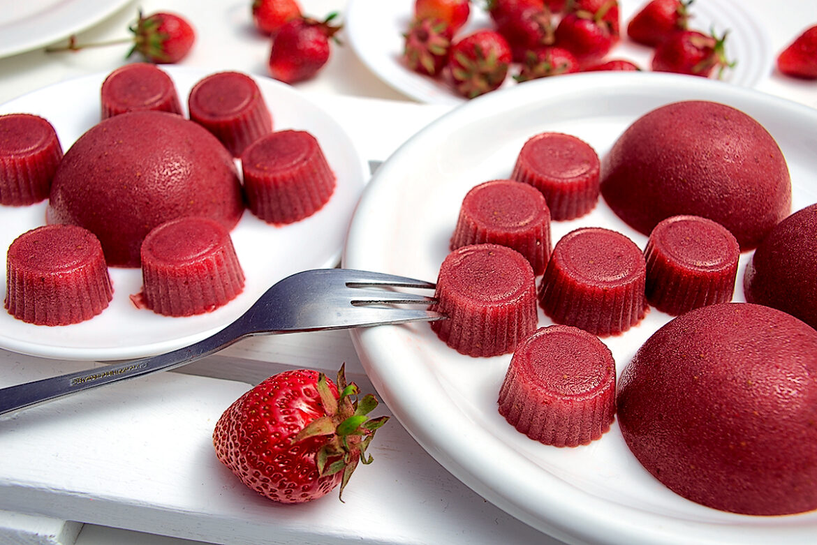 Можна поставити форми в холодильник, але й при кімнатній температурі вони добре застигають. Буквально через годину маєте смачнезні полуничні желейні цукерки.