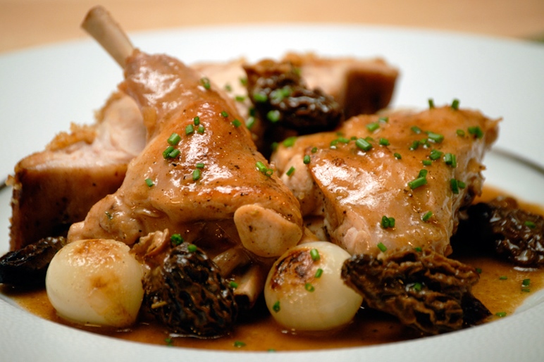 Візьміть стегна кролика, залийте їх вином, додайте розмарин, спеції та сіль. Поставте, щоб маринувалося протягом 1-1,5 години, а найкраще, якщо ніч постоїть в холодильнику.