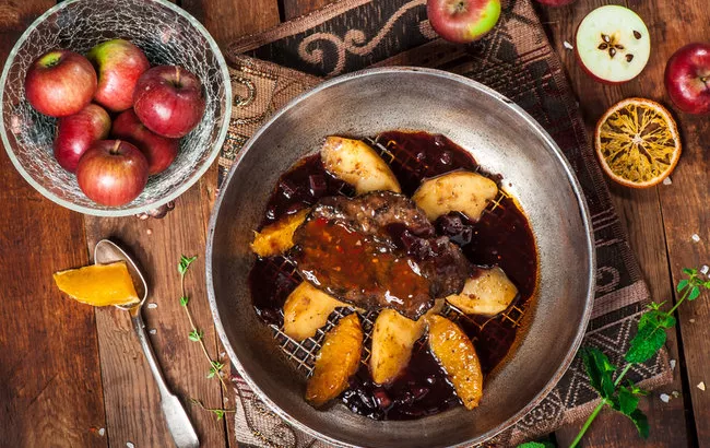 Яблука додадуть м’ясу легку кислинку і фруктовий аромат. Це класичне поєднання, яке можна приготувати різними способами: обсмажити або тушкувати на сковороді, запекти в духовці або приготувати в мультиварці.