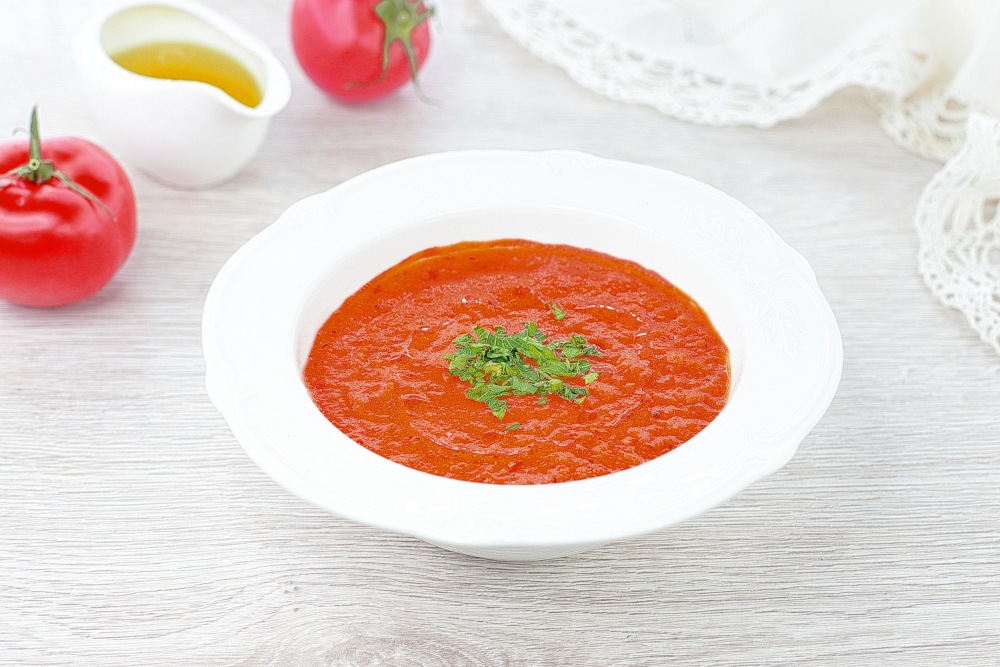 Картоплю потрібно почистити та відварити до готовності. Відвар не зливайте, а процідіть через сито. Картоплю розімніть, а помідори перед додаванням треба перетерти через сито. Розведіть все картопляним відваром.