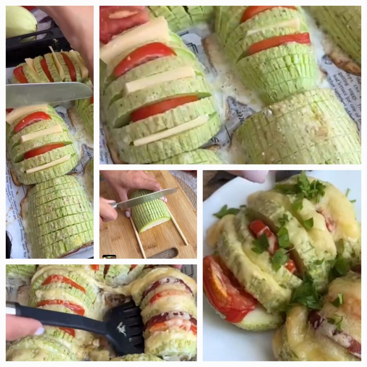 Кабачок помийте та витріть. Пошкрябайте його вздовж виделкою та розріжте так само навпіл. Тепер кожну половинку надріжте на кілька проміжків шириною по кілька міліметрів, але не до кінця. Вийде така кабачкова платформа. Посоліть кабачки.