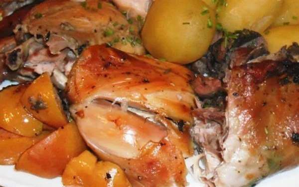 Стегна обсмажте на розігрітій по декілька хвилин з кожного боку до золотої скоринки й перекладіть в рукав до овочів. Покладіть запікатися у розігріту до 190 градусів духовку на 1,5 години. Смачного!