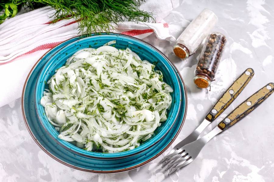 Таким маринадом треба залити цибулю із зеленню. Все слід ретельно перемішати. Потім каструлю з цибулею потрібно накрити кришкою та залишити на півгодини. Через цей час цибулю можна їсти.